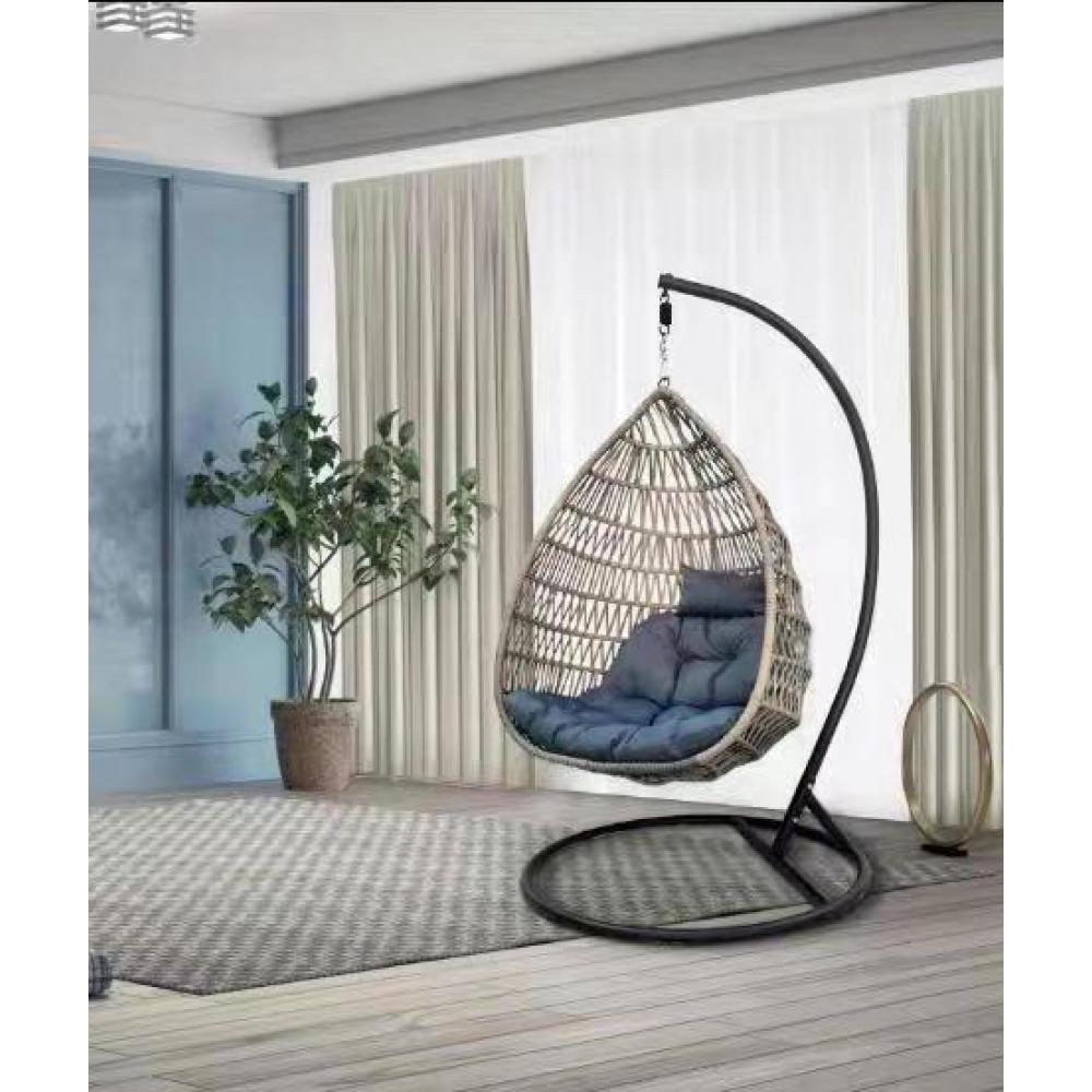 Размер корзины: WH131хW91хD68 см Стойка: H2,0xD1,0 м, Каркас сталь. Материал плетения на корзине: искусственный ротанг серого цвета. Подушка однотонная синяя. Ткань с водоотталкивающей пропиткой. Допустимая нагрузка: 120 кг.