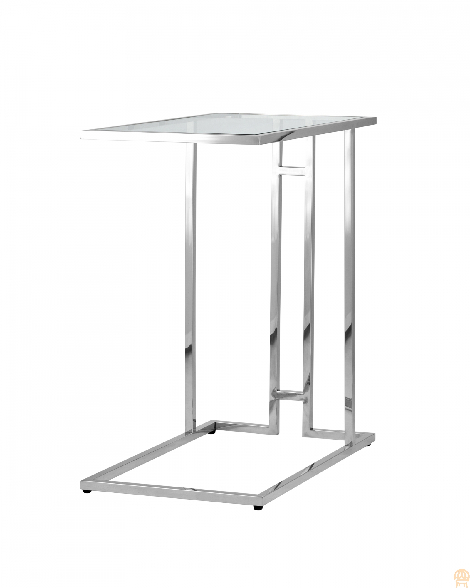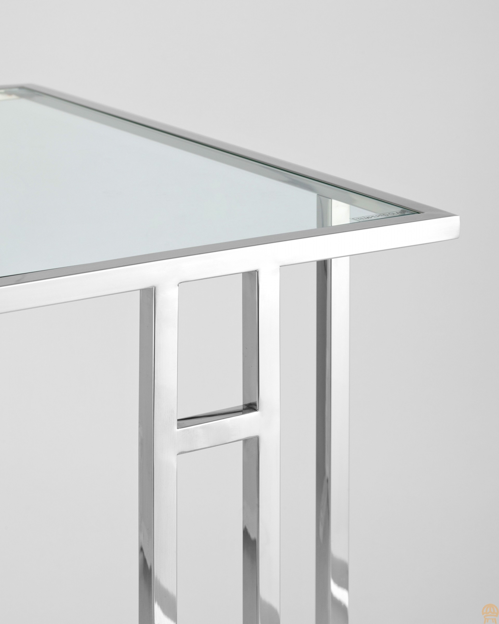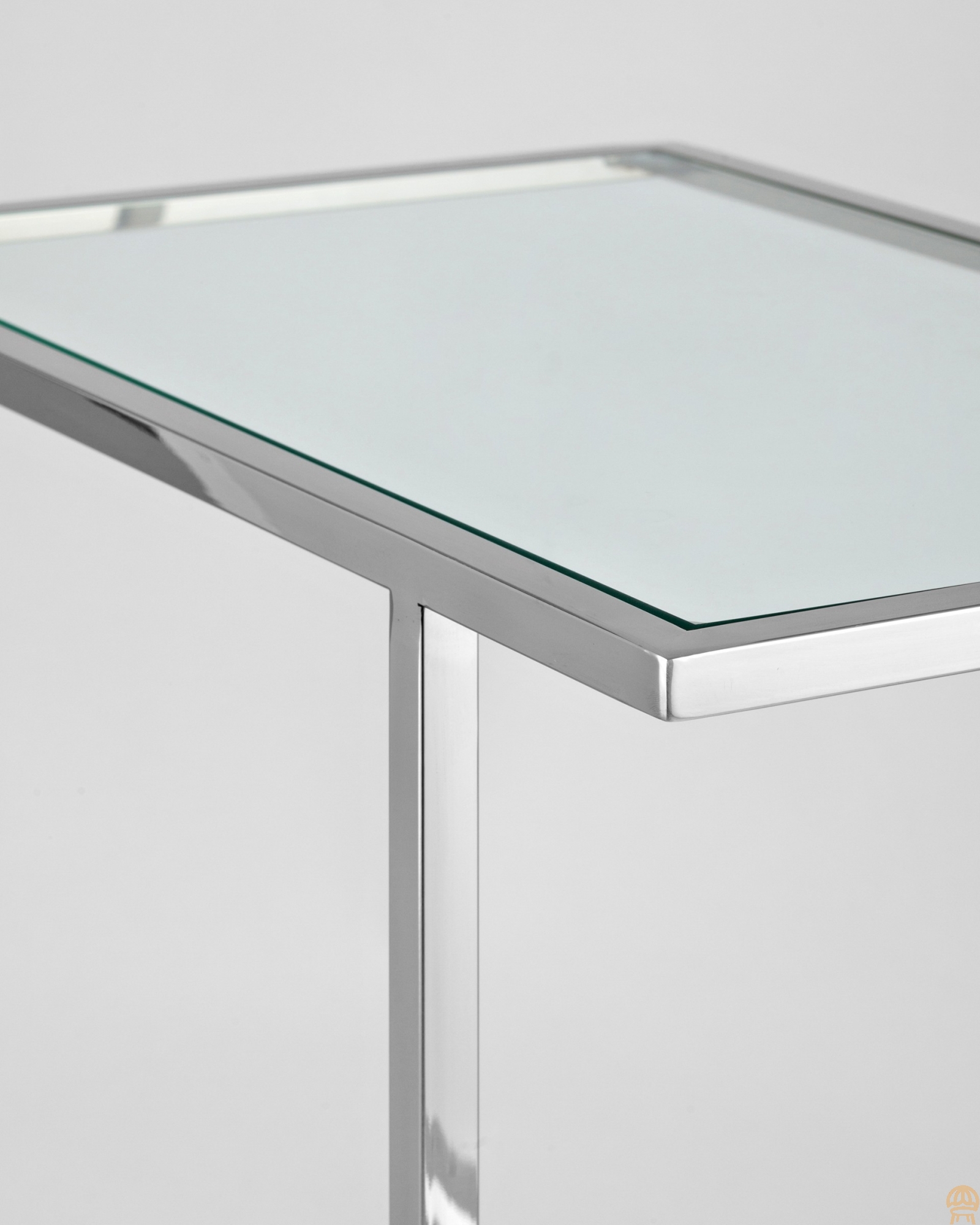 Журнальный столик из нержавеющей стали 50*32. Столешница из закаленного стекла прозрачного цвета. Каркас сталь цвета серебра.