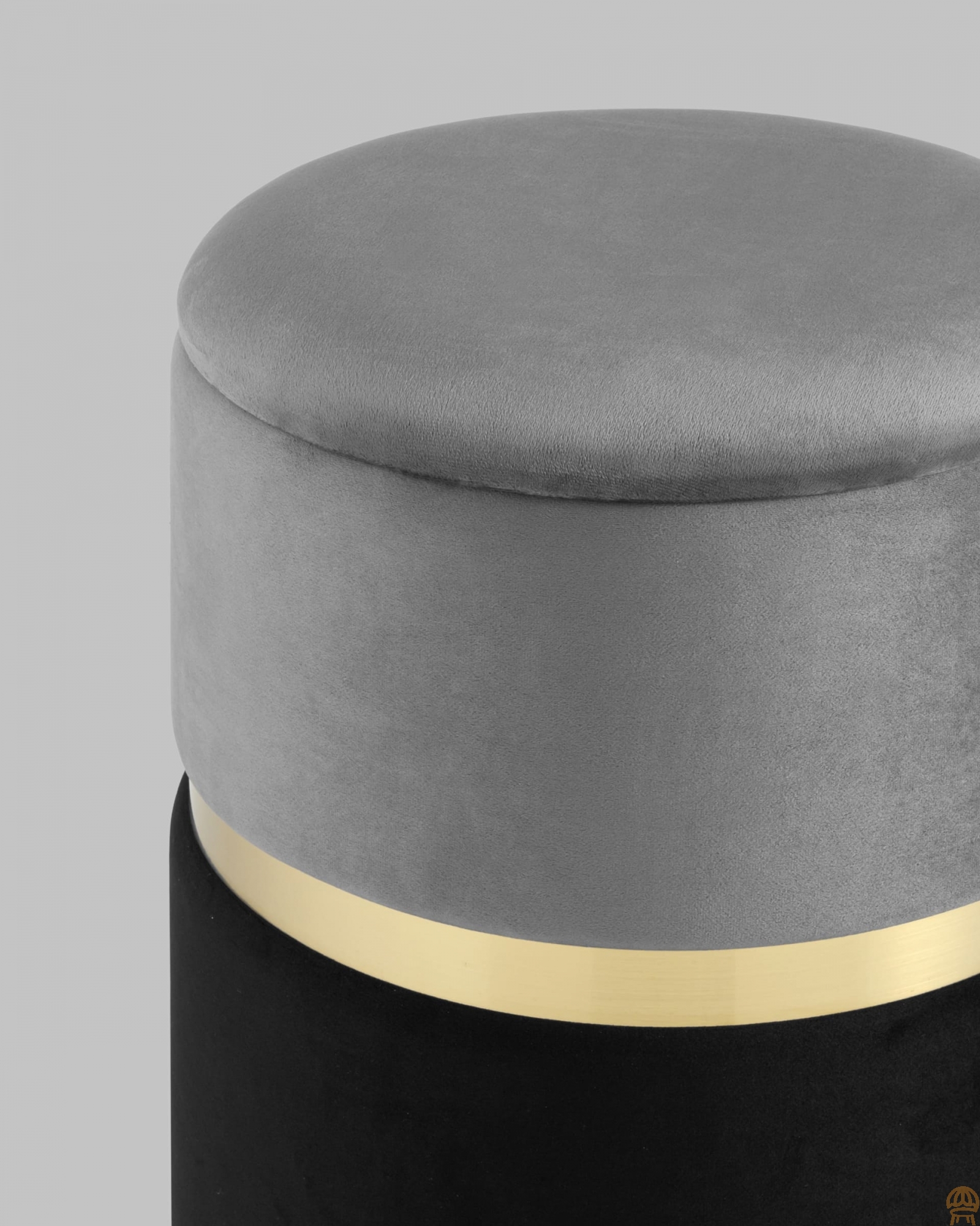 Лаконичная модель пуфа в мягкой обивке прекрасно впишется в современные интерьеры. Обивка выполнена из велюра в светлом и темном оттенках и украшена металлическим ободком в золотом цвете. Под сиденьем имеется ящик для хранения различных мелочей. В основании предусмотрены специальные подпятники, которые делают пуф более устойчивым и предотвращают скольжение.