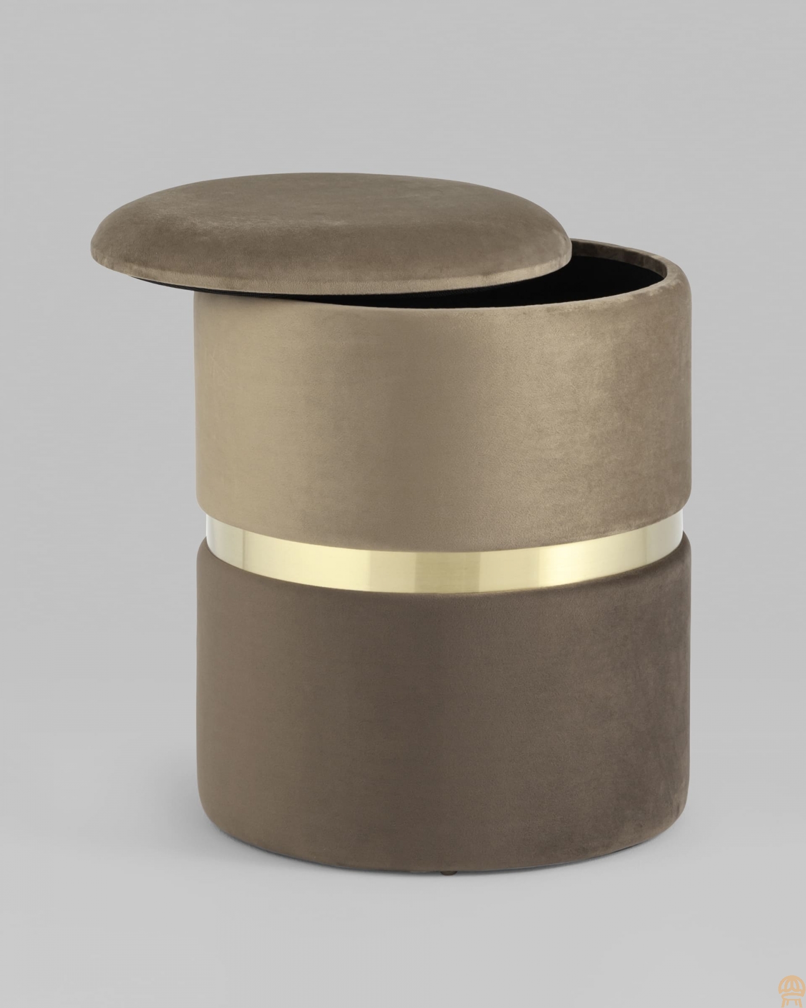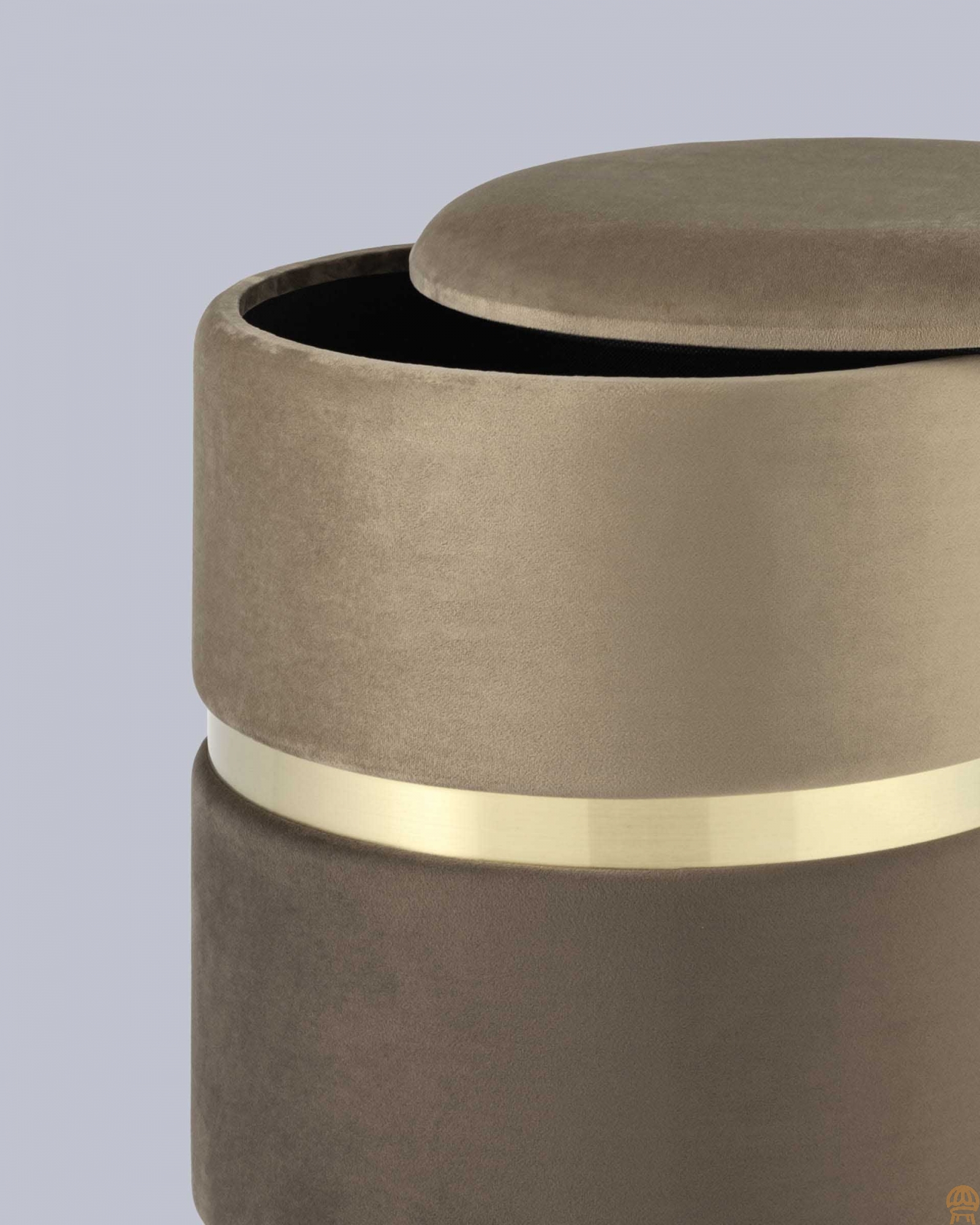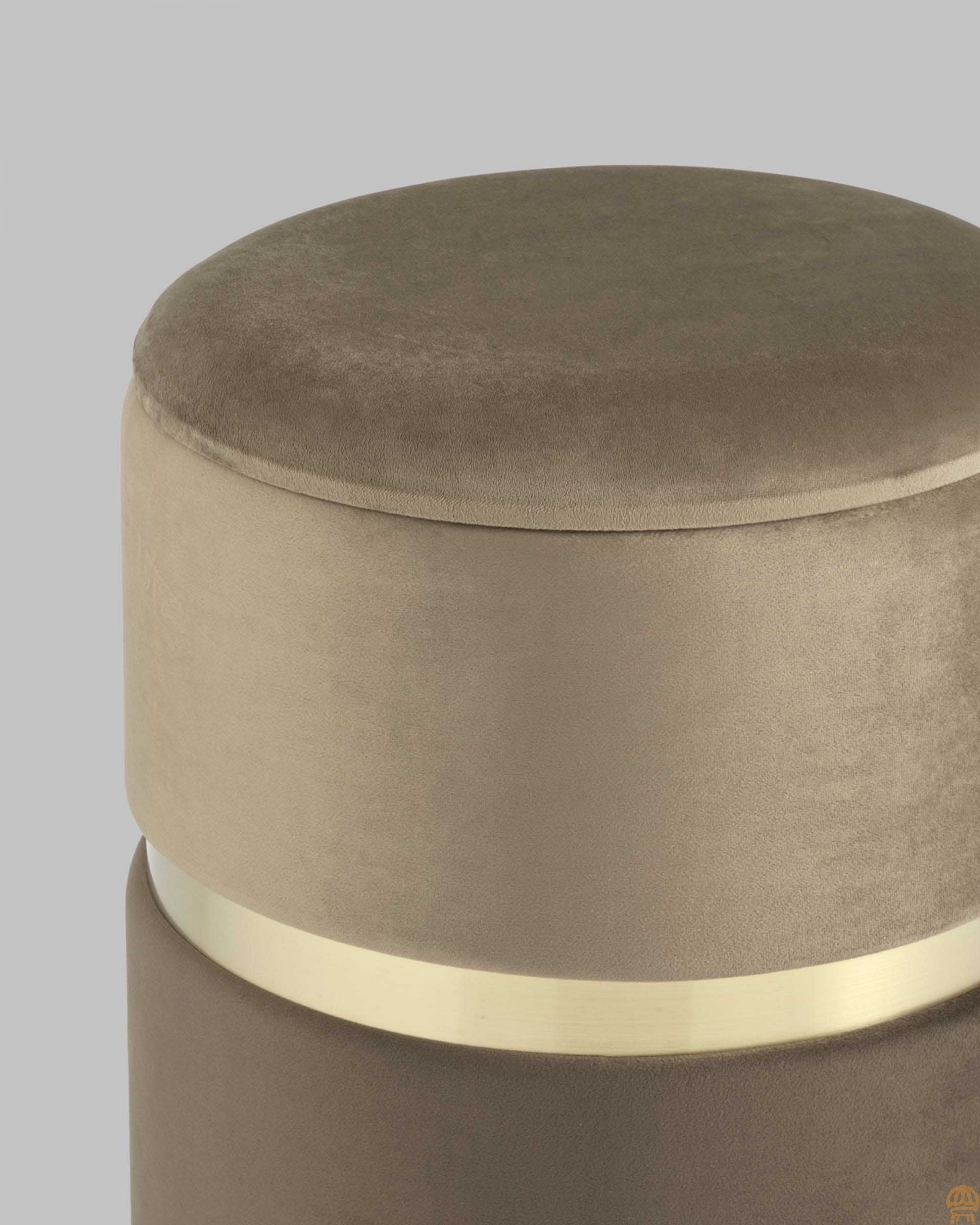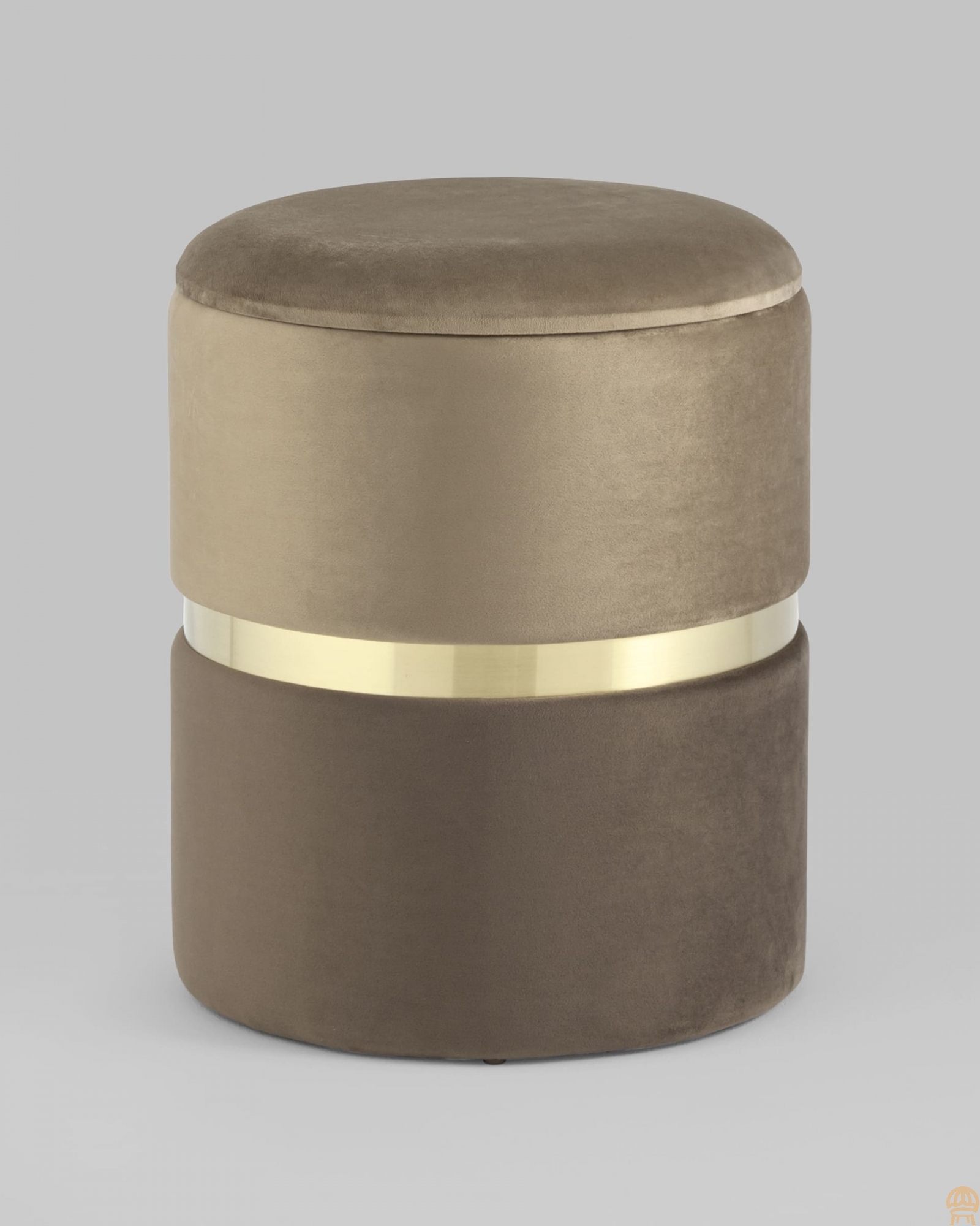 Лаконичная модель пуфа в мягкой обивке прекрасно впишется в современные интерьеры. Обивка выполнена из велюра в светлом и темном оттенках и украшена металлическим ободком в золотом цвете. Под сиденьем имеется ящик для хранения различных мелочей. В основании предусмотрены специальные подпятники, которые делают пуф более устойчивым и предотвращают скольжение.