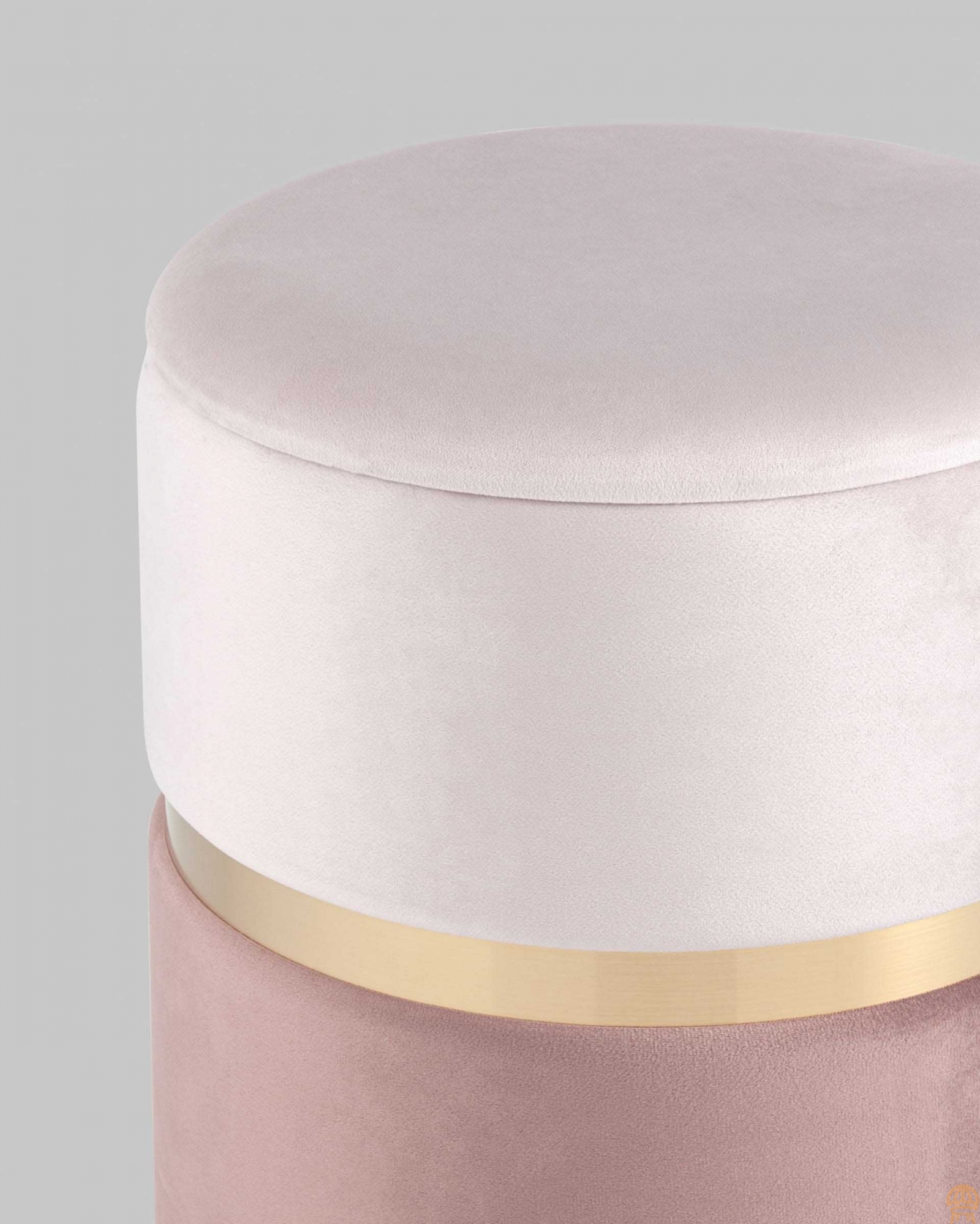 Лаконичная модель пуфа в мягкой обивке прекрасно впишется в современные интерьеры. Обивка выполнена из велюра в светлом и темном оттенках и украшена металлическим ободком в золотом цвете. Под сиденьем имеется ящик для хранения различных мелочей. В основании предусмотрены специальные подпятники, которые делают пуф более устойчивым и предотвращают скольжение.