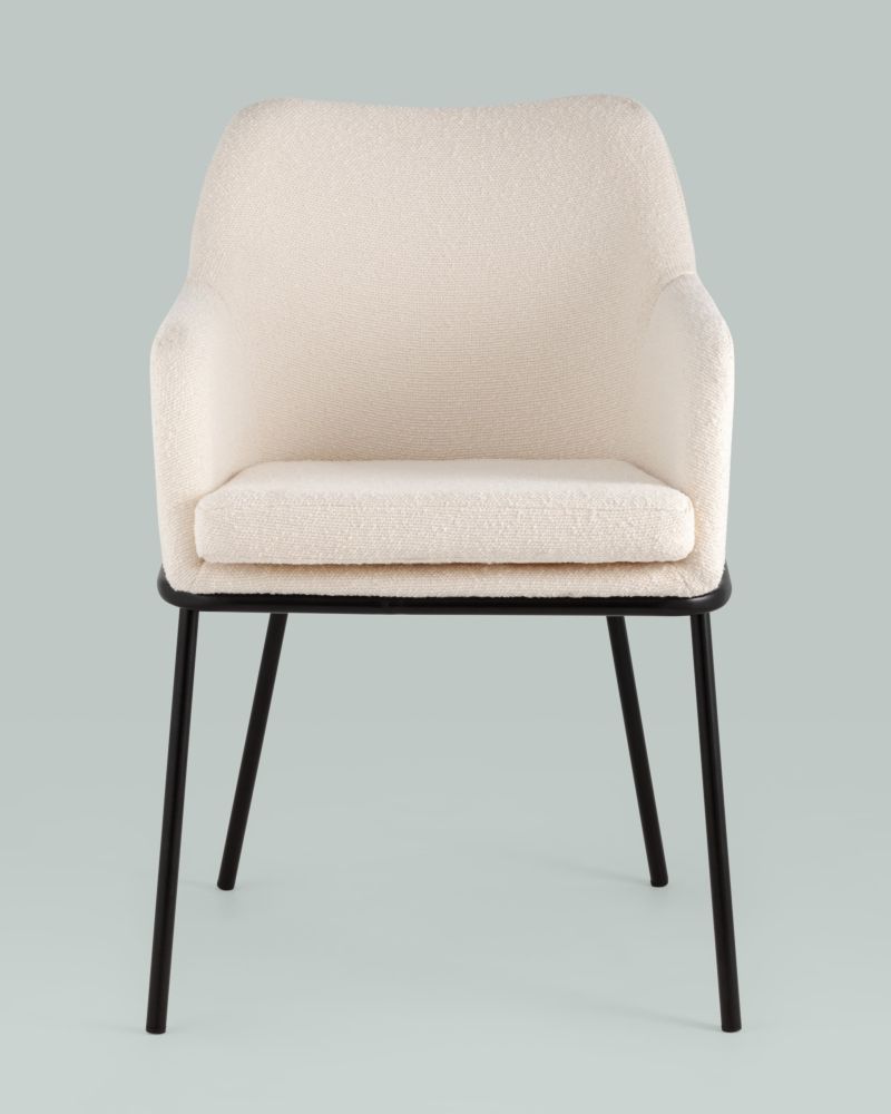 Изящный стул с комфортным сиденьем и спинкой. Основание и ножки черного матового цвета изготовлены из прочного металла. Обивка выполнена из прочной ткани с мягким ворсом в стиле букле, необычная фактура и мягкость добавляют стулу больше уюта.