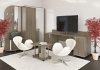 - Фасады по горизонталям, настенные изголовья кроватей и бортики тумб и столов декорированы алюминиевым кантом.