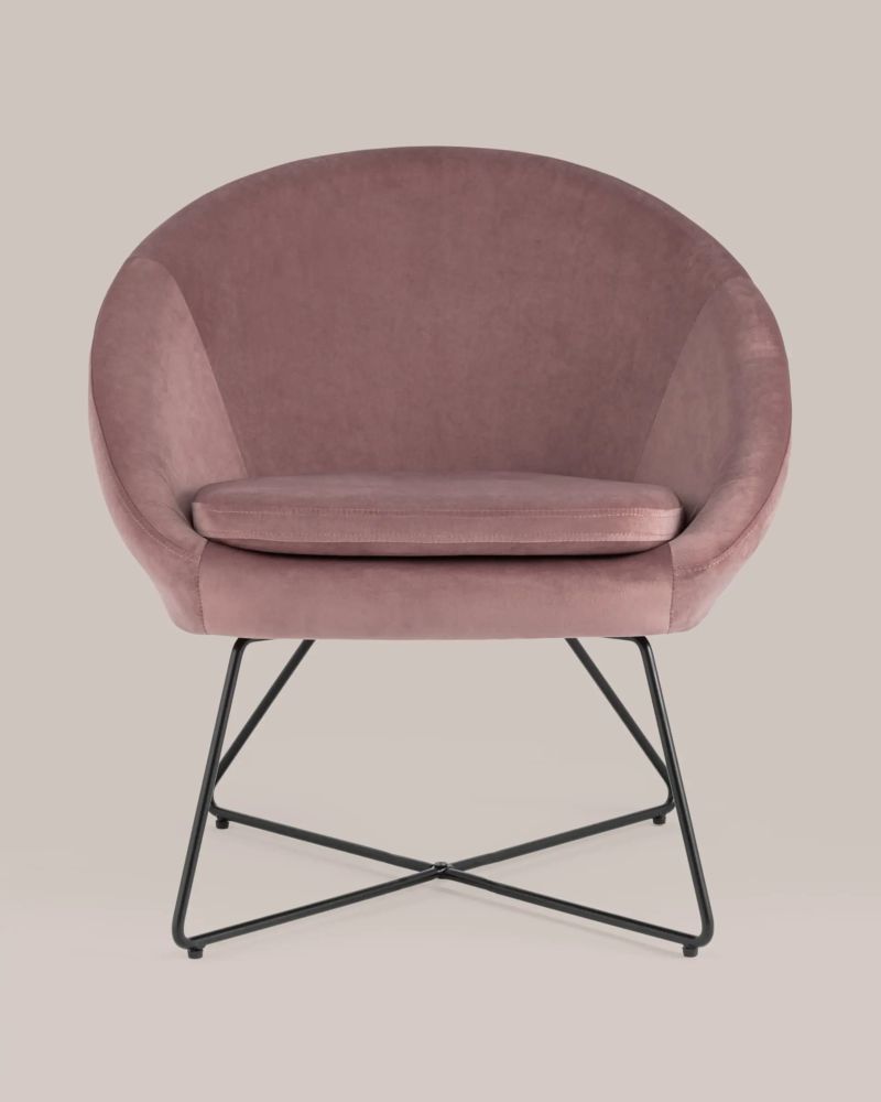 Широкая спинка плавно переходит в удобные подлокотники. Перекрещенные ножки изготовлены из металла и добавляют креслу оригинальности. Для дополнительного комфорта в кресле есть мягкое плотное сиденье. В качестве обивки используется велюр, приятный на ощупь. Металлический каркас добавляет устойчивости и выдерживает нагрузку до 120 кг.