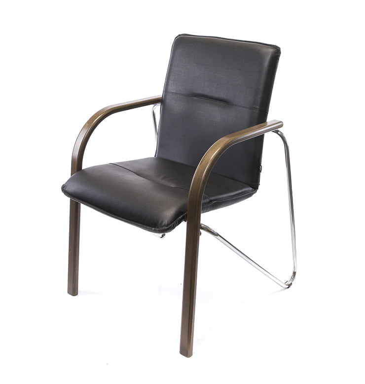 Конференц-кресло с обивкой из высококачественного кожезаменителя. Каркас металлический, покрыт износоустойчивой краской цвета "серебро". Декоративная отделка из массива дерева.