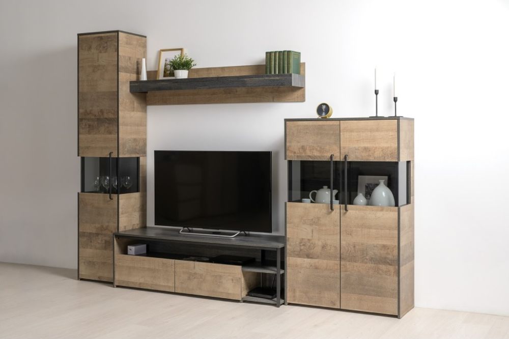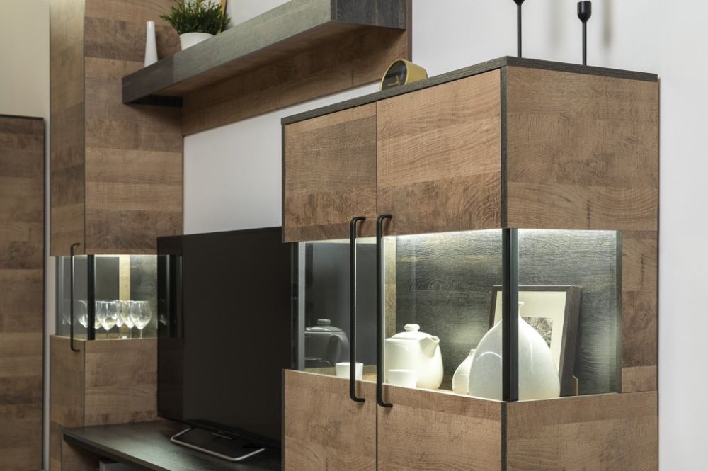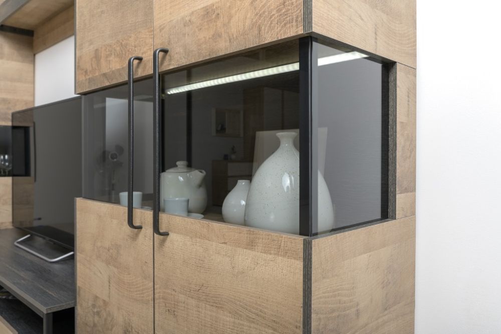 Все петли и направляющие оснащены доводчиками, что несомненно сделает ежедневное пользование приятным и безопасным. Металлические стойки с регулируемыми опорами делают эту мебель надёжной, аутентичной и функциональной.Лицевая фурнитура с тем же покрытием придаёт мебели индустриальную эстетику. Светодиодная подсветка в витринах с тонированным стеклом эффектно подчёркивает аксессуары.Условия покупки