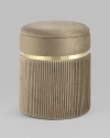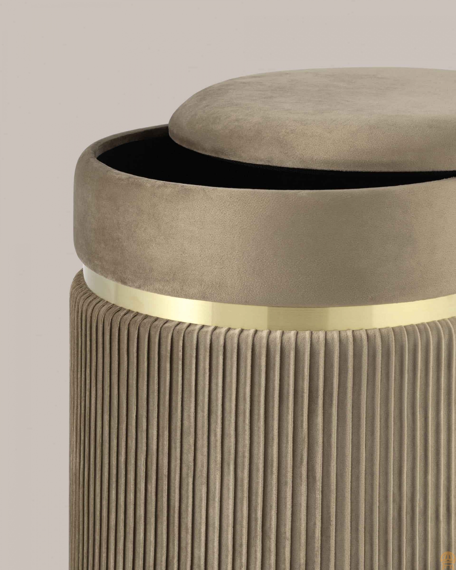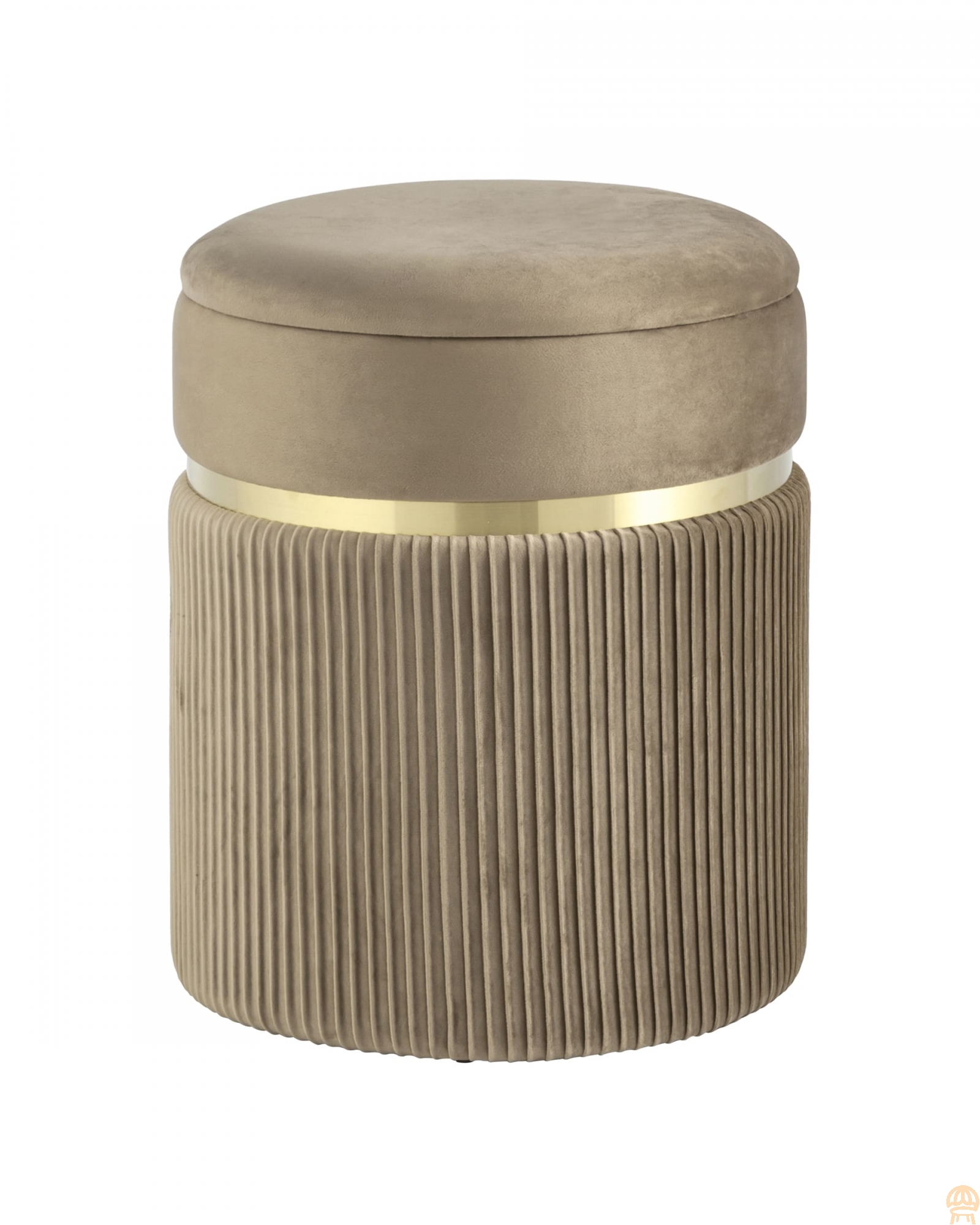 Лаконичная модель пуфа в обивке из мягкого велюра, которая дополнит интерьер вашего дома. Обивка красиво украшена декоративными оборками и металлическим ободком в золотом цвете. Под сиденьем имеется ящик для хранения различных мелочей. В основании предусмотрены специальные подпятники, которые делают пуф более устойчивым и предотвращают скольжение.