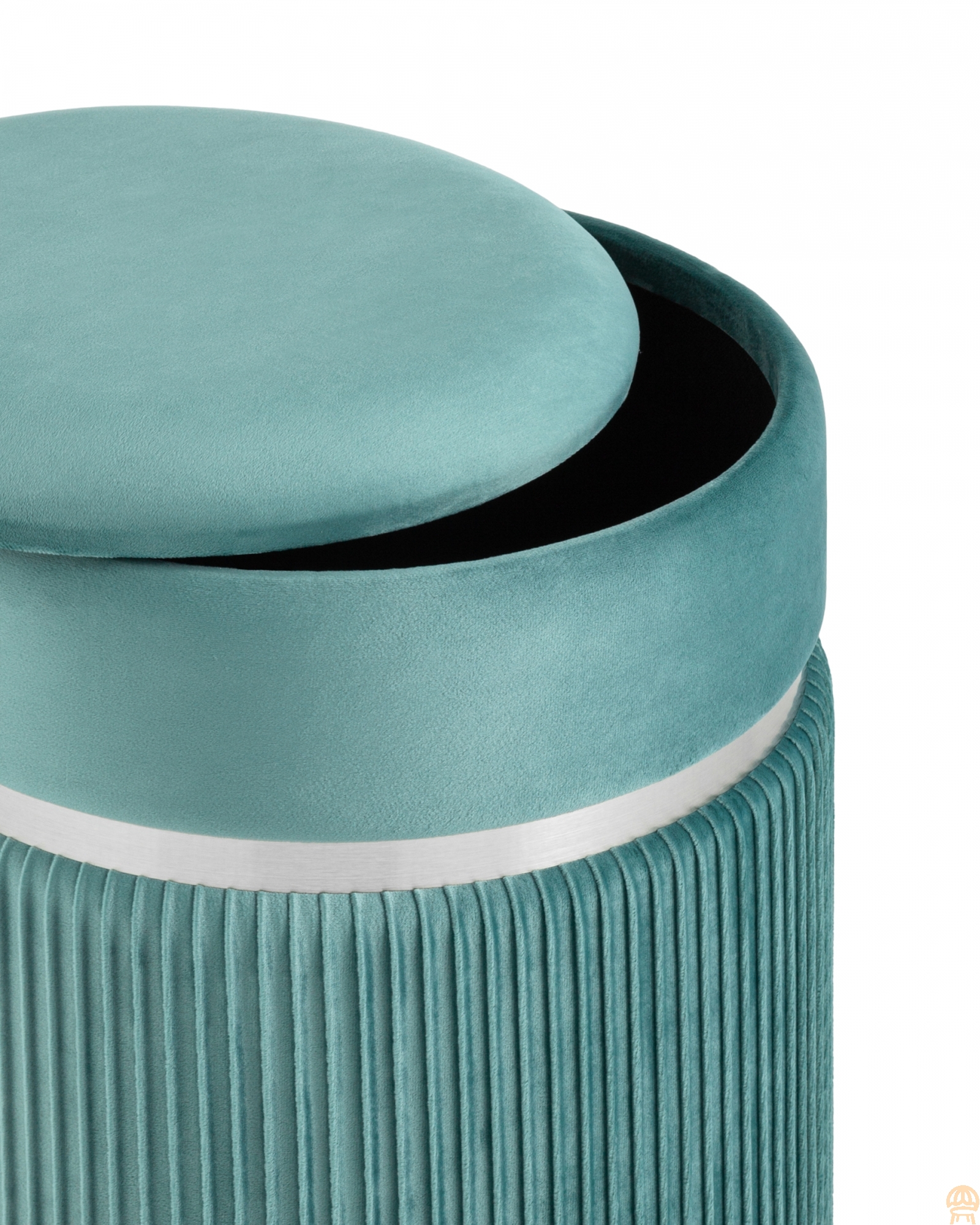 Лаконичная модель пуфа в обивке из мягкого велюра, которая дополнит интерьер вашего дома. Обивка красиво украшена декоративными оборками и металлическим ободком в серебряном цвете. Под сиденьем имеется ящик для хранения различных мелочей. В основании предусмотрены специальные подпятники, которые делают пуф более устойчивым и предотвращают скольжение.