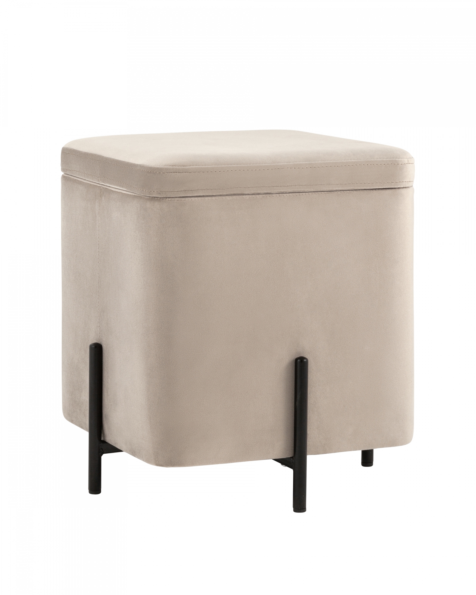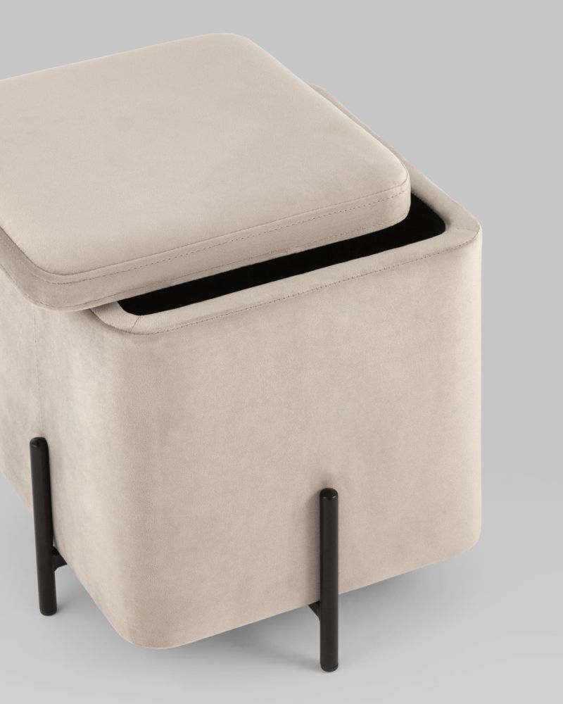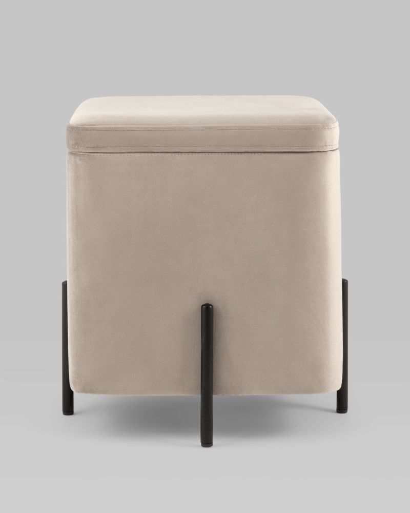 Компактный пуф на металлических ножках. Мягкая обивка выполнена из износостойкого велюра, тактильно приятный и долговечный материал. Металлические ножки черного цвета высотой 13 см. выдерживают нагрузку до 80 кг. Квадратная форма пуфа весьма практична и впишется в любой интерьер комнаты. Под сидением имеется ящик для хранения мелочей, крышка полностью съемная. Подпятники в основании ножек делают пуф более устойчивым и предотвращают скольжение.