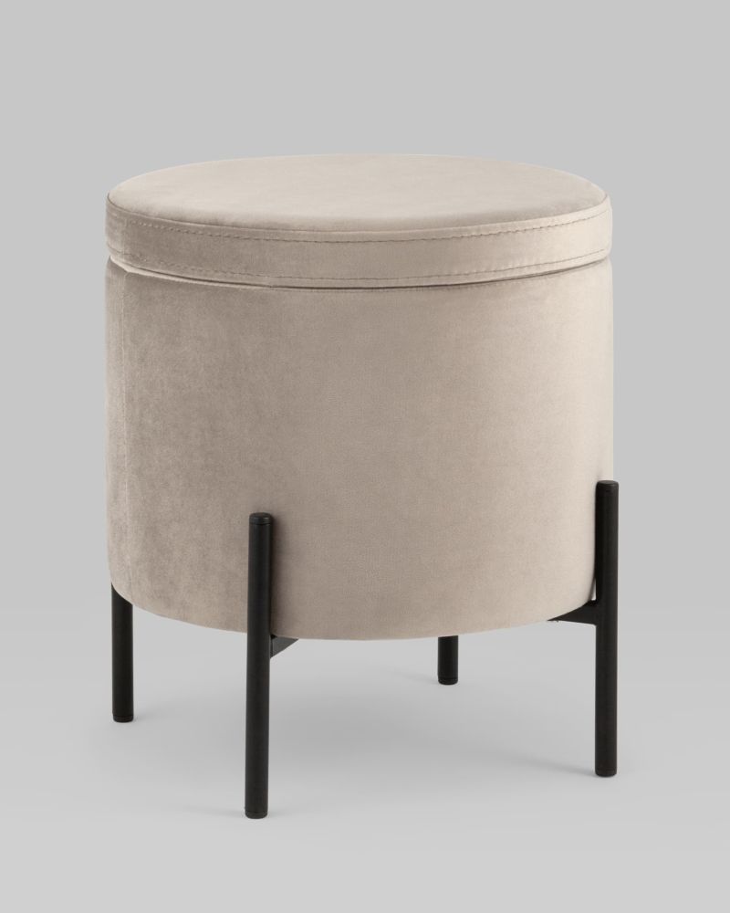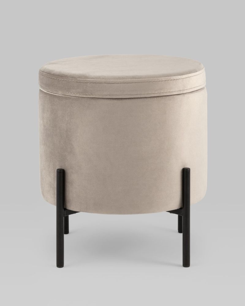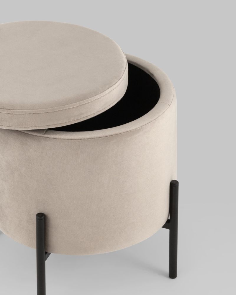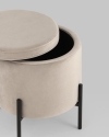 Лаконичный круглый пуф на металлических ножках. Мягкая обивка выполнена из износостойкого велюра, тактильно приятный и долговечный материал. Металлические ножки черного цвета высотой 13 см. выдерживают нагрузку до 80 кг. Подпятники в основании ножек делают пуф более устойчивым и предотвращают скольжение. Под сидением имеется ящик для хранения мелочей, крышка полностью съемная. Пуфик станет отличным дополнением для спальни, прихожей или зала.