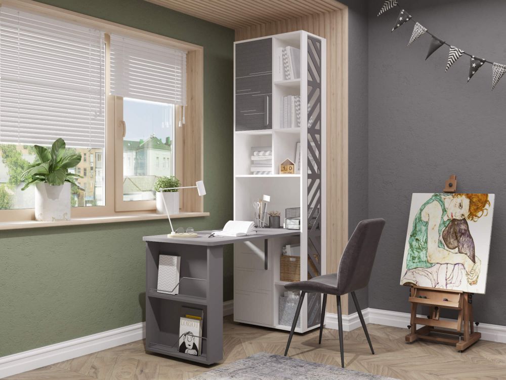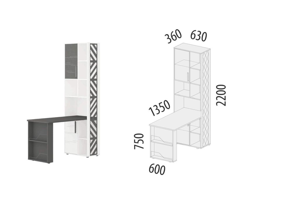 Стол-стеллаж «Аляска 64» включает письменный стол «Аляска 501.16» и стеллаж «Аляска 501.33». Модель выполнена в современном стиле – в актуальном глубоком темно-сером цвете. Стол выполнен из ЛДСП повышенной прочности. Просторная рабочая поверхность стола и открытые и закрытые полки стеллажа позволяют удобно разместить как компьютерное оборудование, так и канцелярские принадлежности, книги, документы.