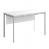 Столешница из ЛДСП т.22мм. Металлокаркас из трубы 40х20х1,5мм. без регулировки внизу. Опоры столов комплектуются пластиковой заглушкой. Покрытие краска белая полуматовая или алюминий. Металлокаркас соединяется со столешницей через металлическую проставку D-16мм. H-6мм. Комплектуется фронтальной панелью из ЛДСП т. 18мм. крепится к столешнице при помощи уголков.