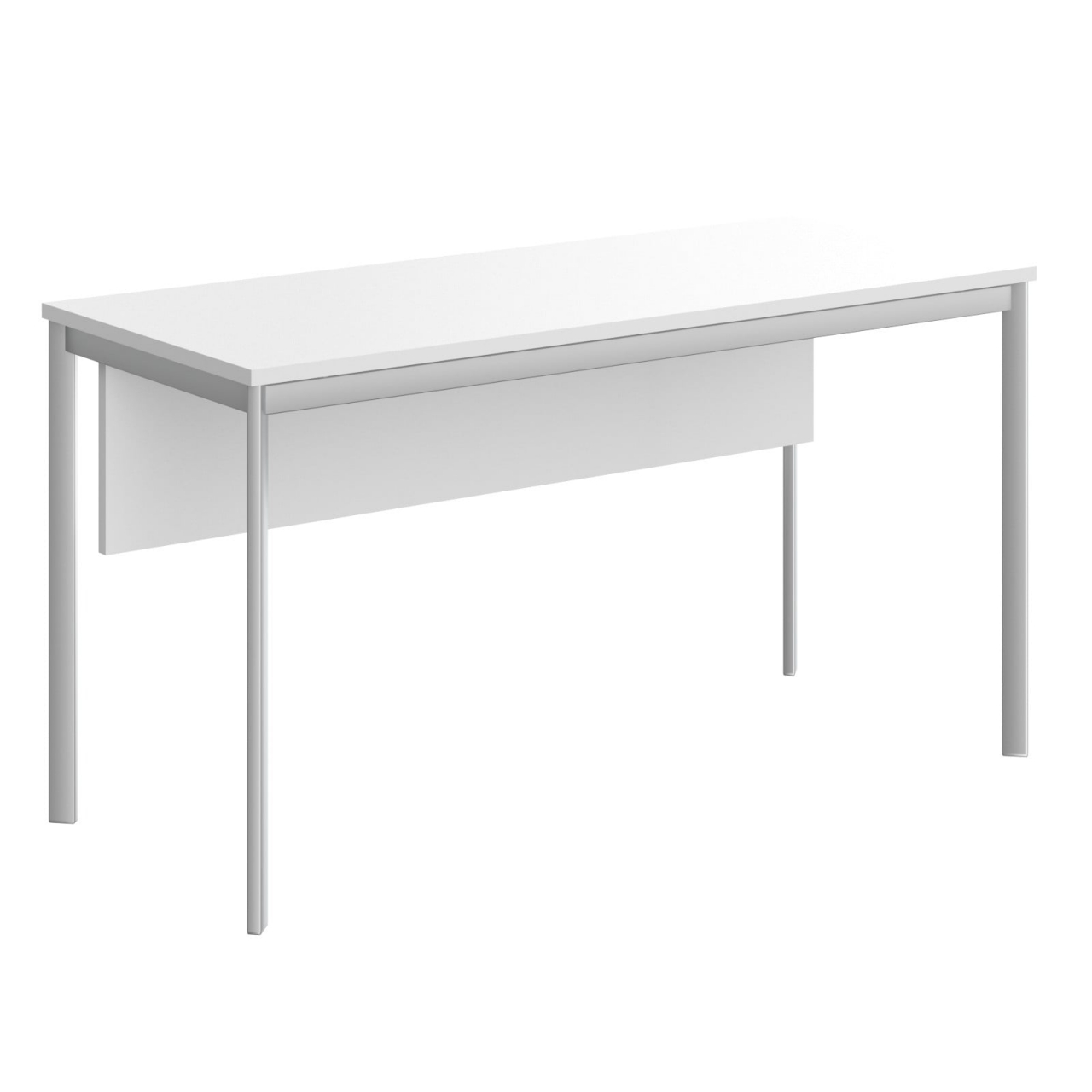 Столешница из ЛДСП т.22мм. Металлокаркас из трубы 40х20х1,5мм. без регулировки внизу. Опоры столов комплектуются пластиковой заглушкой. Покрытие краска белая полуматовая или алюминий. Металлокаркас соединяется со столешницей через металлическую проставку D-16мм. H-6мм. Комплектуется фронтальной панелью из ЛДСП т. 18мм. крепится к столешнице при помощи уголков.