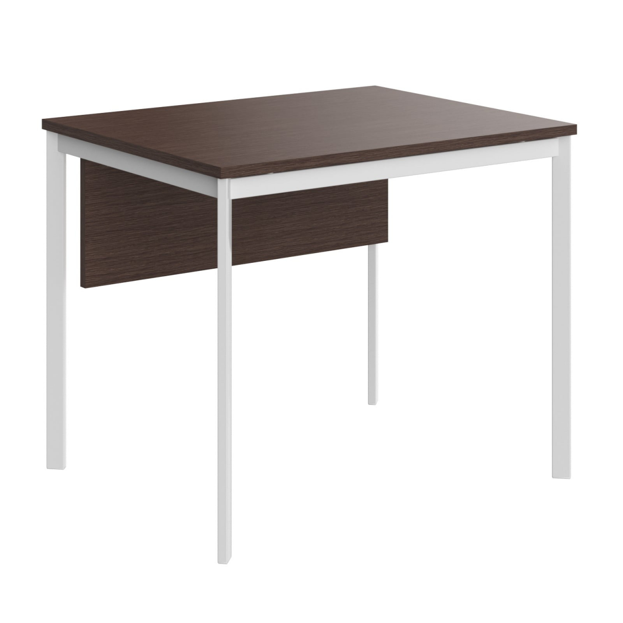 Столешница из ЛДСП т.22мм. Металлокаркас из трубы 40х20х1,5мм. без регулировки внизу. Опоры столов комплектуются пластиковой заглушкой. Покрытие краска белая полуматовая или алюминий. Металлокаркас соединяется со столешницей через металлическую проставку D-16мм. H-6мм. Комплектуется фронтальной панелью из ЛДСП т. 18мм. крепится к столешнице при помощи уголков.