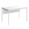 Столешница из ЛДСП т.22мм. Металлокаркас из трубы 40х20х1,5мм. без регулировки внизу. Опоры столов комплектуются пластиковой заглушкой. Покрытие краска белая полуматовая или алюминий. Металлокаркас соединяется со столешницей через металлическую проставку D-16мм. H-6мм. Комплектуется фронтальной панелью из ЛДСП т. 18мм. крепится к столешнице при помощи уголков.