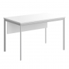 Столешница из ЛДСП т.22мм. Металлокаркас из трубы 40х20х1,5мм. без регулировки внизу. Опоры столов комплектуются пластиковой заглушкой. Покрытие краска белая полуматовая или алюминий. Металлокаркас соединяется со столешницей через металлическую проставку D-16мм. H-6мм. Комплектуется фронтальной панелью из ЛДСП т. 18мм. крепится к столешнице при помощи уголков.