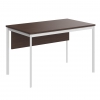 Столешница из ЛДСП т.22мм. Металлокаркас из трубы 40х20х1,5мм. без регулировки внизу. Опоры столов комплектуются пластиковой заглушкой. Покрытие краска белая полуматовая или алюминий. Металлокаркас соединяется со столешницей через металлическую проставку D-16мм. H-6мм. Комплектуется фронтальной панелью из ЛДСП т. 18мм. крепится к столешнице при помощи уголков.