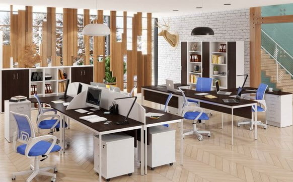 Столешница из ЛДСП т.22мм. Металлокаркас из трубы 40х20х1,5мм. без регулировки внизу. Опоры столов комплектуются пластиковой заглушкой. Покрытие краска белая полуматовая или алюминий. Металлокаркас соединяется со столешницей через металлическую проставку D-16мм. H-6мм. Комплектуется фронтальной панелью из ЛДСП т. 18мм. крепится к столешнице при помощи уголков.