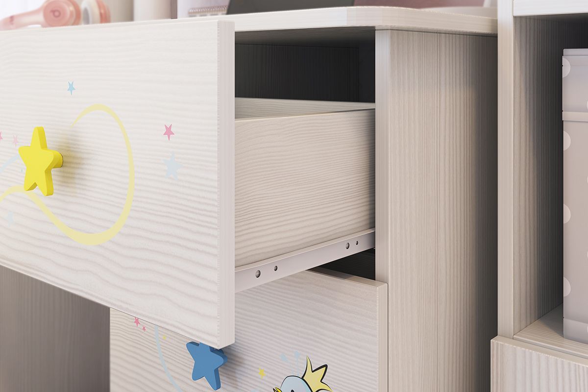 для хранения учебников и школьных принадлежностей. В 3-х выдвижных ящиков поместится все, что необходимо для учебы и творчества. Необычный принтерный рисунок на фасадах выдержан в общем стилистическом решении. Рисунок устойчив к истиранию и ультрафиолету.