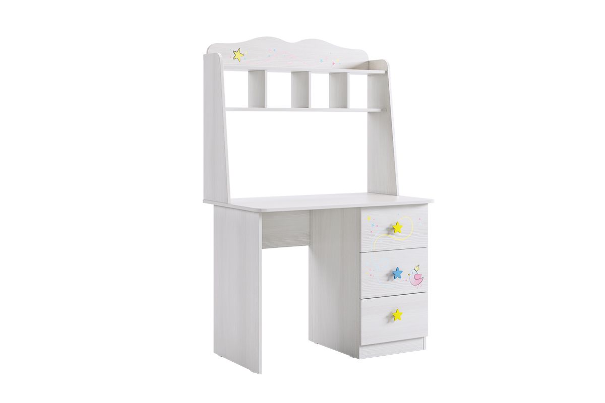 Стильный и модный стол детской «Чудо» - обрадует каждого ребенка. Компактный стол прекрасно впишется даже в маленькое пространство детской комнаты. Удобная столешница подойдет как для письма, так и для занятий на компьютере или ноутбуке. Открытые полки надстройки стола хорошо подходят