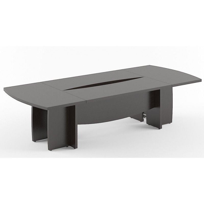Стол переговорный имеет крепкие надежные опоры, устойчив и практичен. Конструкция модели имеет оригинальные особенности – необычный монументальный каркас и декоративный разрез столешницы. Стол смотрится нестандартно и вместе с тем импозантно и престижно.