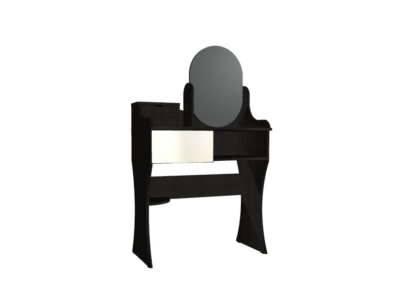 Замечательно подойдет для небольших помещений, идеален для каждой женщины. Оснащено, помимо множества мест хранения вещей и необходимых мелочей, поворотным зеркалом. С помощью данной конструкции вы легко можете отрегулировать угол наклона вашего отражения. Из «изюминок» данной модели также можно отметить полку под столешницей. Ее отличительная особенность - возможность установки с правой или с левой стороны, в зависимости от удобства пользователя стола. За стенкой, оформленной винилкожей, находится глубокий ящик для хранения вещей.