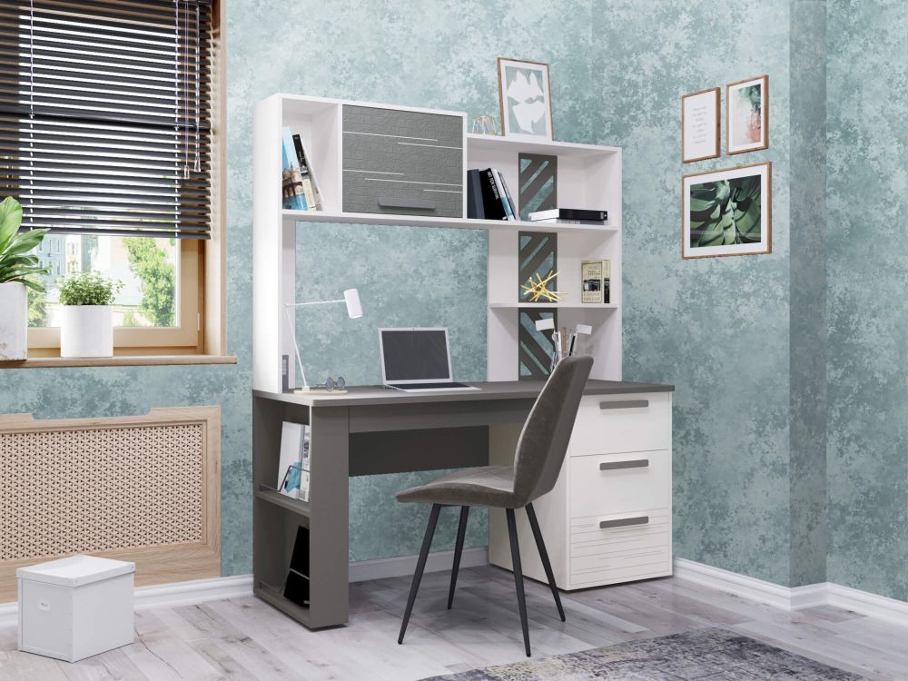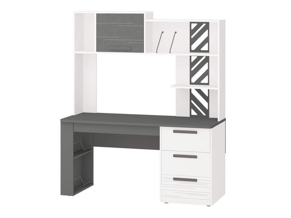 Стол с надстройкой «Аляска 63» включает письменный стол «Аляска 501.24» и надстройку «Аляска 501.25». Модель выполнена в современном стиле – в актуальном сочетании белого с глубоким темно-серым цветом. Корпус стола, фасады ящиков, надстройка выполнены из ЛДСП повышенной прочности.