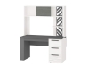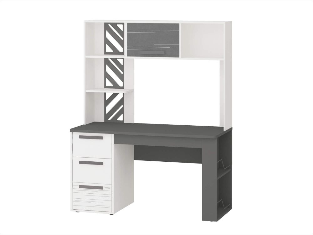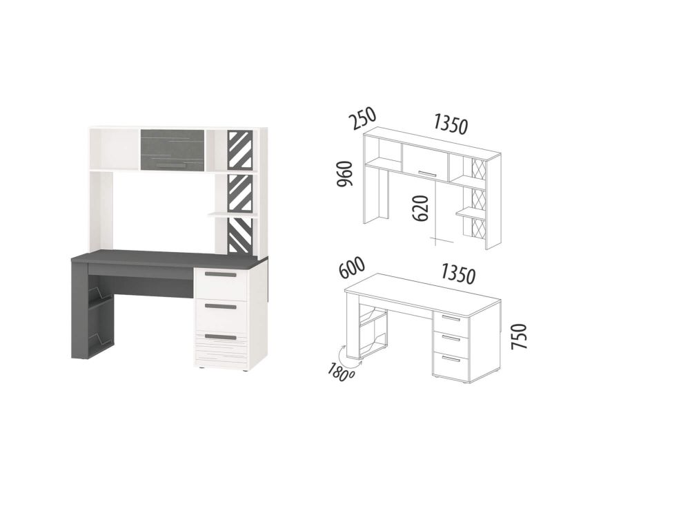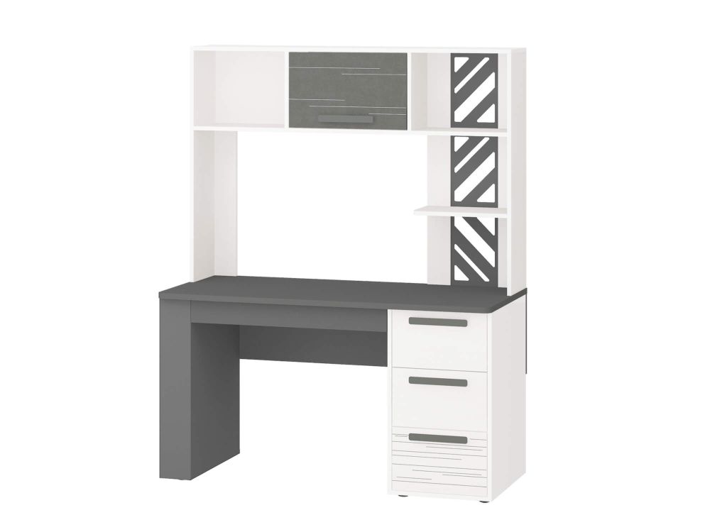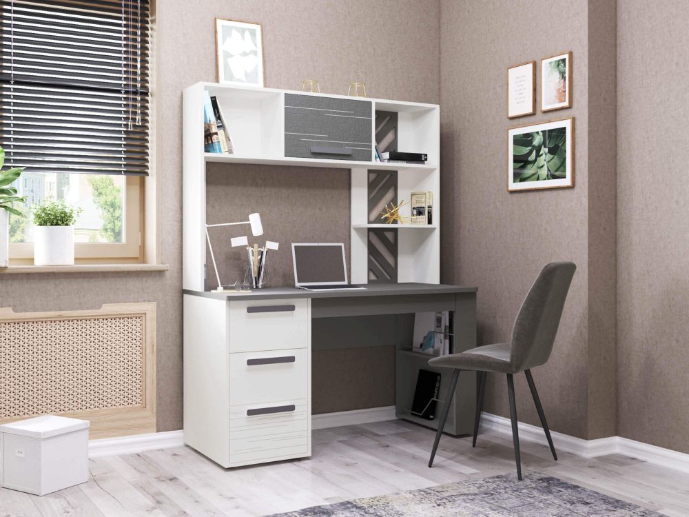 Стол с надстройкой «Аляска 62» включает письменный стол «Аляска 501.14» и надстройку «Аляска 501.19». Модель выполнена в современном стиле – в актуальном сочетании белого с глубоким темно-серым цветом. Корпус стола, фасады ящиков, надстройка выполнены из ЛДСП повышенной прочности.