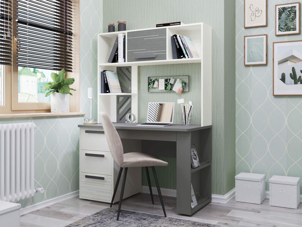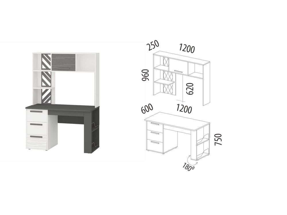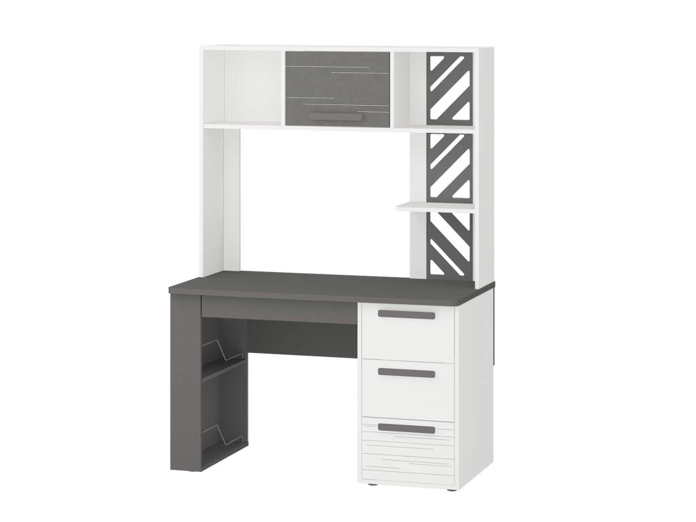 Стол с надстройкой «Аляска 61» включает письменный стол «Аляска 501.15» и надстройку «Аляска 501.23». Модель выполнена в современном стиле – в актуальном сочетании белого с глубоким темно-серым цветом. Корпус стола, фасады ящиков, надстройка выполнены из ЛДСП повышенной прочности.