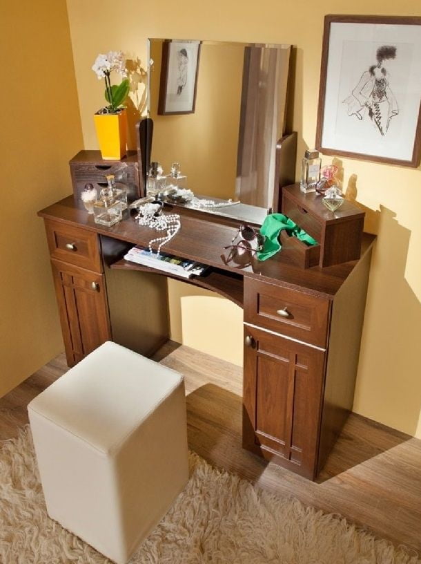 Предмет гордости многих женщин — туалетный столик в классическом стиле можно дополнить трюмо с поворотным зеркалом.
