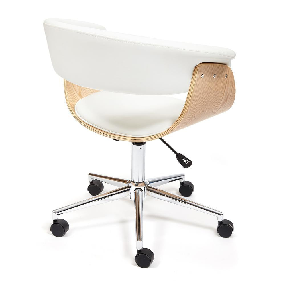 Сочетание деревянного каркаса натурального оттенка, хромированной крестовины и обивки из белой искусственной кожи выглядит стильно и элегантно.
