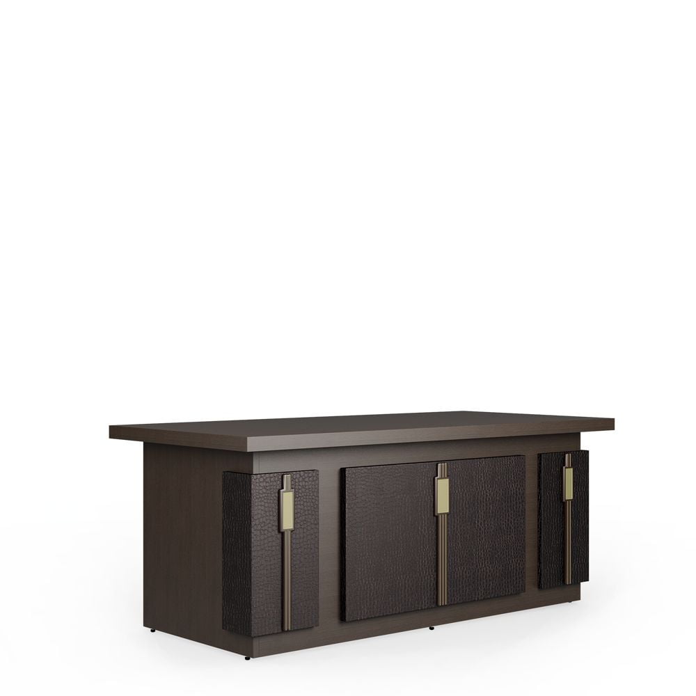 Мебель этой серии многофункциональна, эргономична, удобна, проста и долговечна в процессе эксплуатации (покрытие материалов обеспечивает защиту от истирания, мелких сколов и царапин). Кабинет Chicago представлен в цвете темный орех с сохранением уникального древесного рисунка. Мебель изготовлена из высокопрочного МДФ ЛДСП с использование экокожи для декора. Толщина столешниц составляет 50 мм, каркасов – 18 мм, топов тумб и шкафов – 25 мм. Задние стенки шкафов изготовлены из ЛДСП толщиной 10 мм. Использовано тонированное стекло.