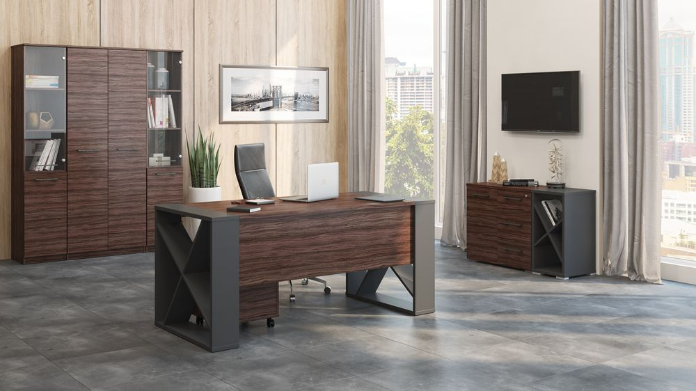Мебель этой серии многофункциональна, эргономична, удобна, проста и долговечна в процессе эксплуатации (покрытие материалов обеспечивает защиту от истирания, мелких сколов и царапин). Кабинет представлен в современном стиле. Оригинальные модели выполнены в цвете оливы и светлого дуба с сохранением древесного рисунка. Мебель изготовлена из высокопрочного ЛДСП. Толщина столешниц и топов составляет 25 мм, каркасов и опор столов – 16 мм. Опоры регулируются по высоте, что позволяет компенсировать неровности пола.
